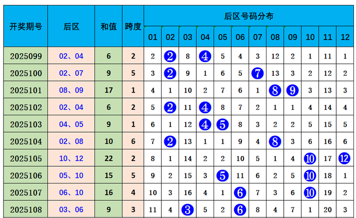 后区上期开出号码03、06,为奇偶组合,近十期后区奇偶比为5:15,偶数走势较高,本期后区参考奇偶比2:0,要点两码推选03、09。