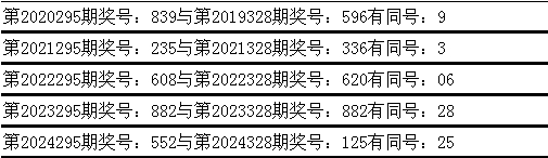 与前期历史同时奖号对比分析,在最近五年开奖中,第295期同时奖号与第328期同时奖号齐出现了洽商号码: