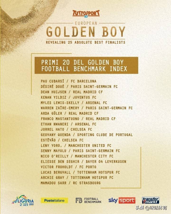 10月15日,金童奖公布了25东谈主的候选名单,在朱门遵守的库巴西、杜埃、怀森、斯凯利、居莱尔、小贝林厄姆等东谈主统统入选! 2025年金童奖25东谈主候选: ...